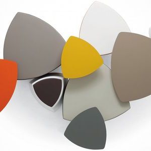 Table bases are available in chrome or white-lacquered steel. White MDF tops are available in large oval, round, square or small oval. The smallest version (51x47 cm) is available with oval base and table top edge lacquered in seven vibrant colors – light blue, gray, moka, red, sand, green and black – in addition to white.